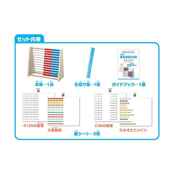 120までの数唱をくり返すことで数の規則性に気づき、121以上の数の理解ができるようになります。そうすることで、たし算・ひき算の力につながります。 ●遊びかた 玉を動かしながら、120までの数唱をします。 付属のシートをセットすることで、120までの数唱だけでなく助数詞をつけて数えるなど数の学習ができます。 ●使いやすいサイズ 本体の幅は幼児の肩幅のサイズなので、無理なく玉を動かすことができます。また、立ててもねかせても使えます。 ●数シートつき いろいろな数の学習ができるシートが2枚付いています。 ●二人で遊べる 仕切り板を使って、二人で遊ぶこともできます。