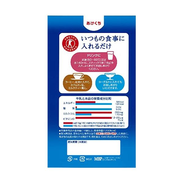 スティック1本で、一日必要分の1/2のカルシウムが摂取できます。 さらにビタミンD、MBPも効率的に摂取できる便利なスキムミルクです。 コップ2杯で一日分のカルシウム。カルシウムをたっぷり摂りたい人に。 栄養機能食品 カルシウム カルシウムは、骨や歯の形成に必要な栄養素です。 1日当たりの摂取目安量 スティック1本(16g)を目安にお召し上がりください。