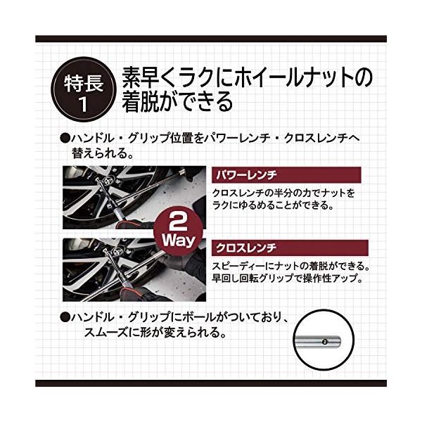 ・【タイヤ交換作業が素早くラクにできる】ハンドル、グリップ位置をパワーレンチ、クロスレンチへ変えられる。