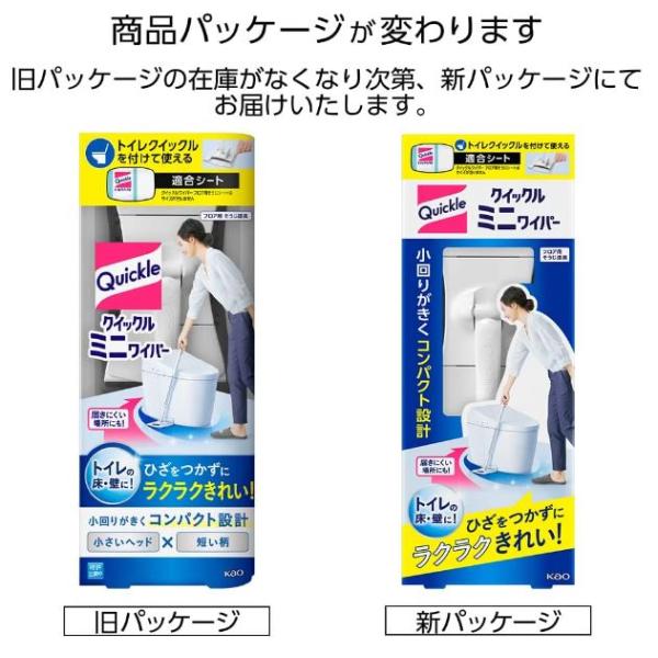 クイックルミニワイパー新登場! 狭いトイレの床奥も、ひざをつかずにラクラクきれい! ヘッドはクイックルワイパーの1/2サイズ、柄の長さは2/3の小回りがきくコンパクト設計だから、届きにくくておそうじが大変なトイレの床奥でもひざをつかずにラクに拭ける。 トイレクイックルを半裁して装着(クイックルワイパー フロア用そうじシートはサイズが合いません) 滑らせるだけの軽い力で汚れを捕集。 着脱も簡単で、汚れたシートに触らずに捨てられる。