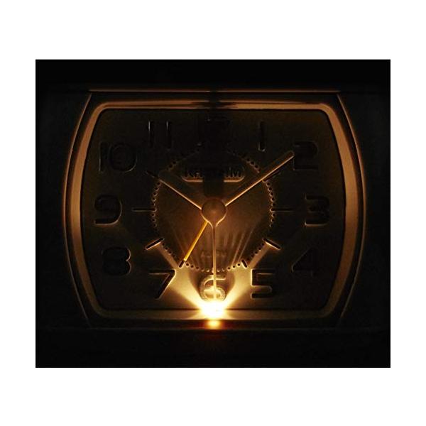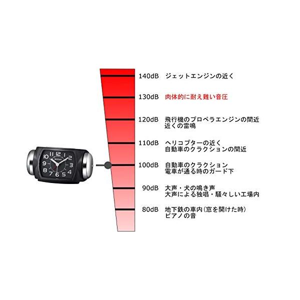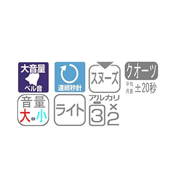 大音量ベル音アラーム ベル音量2段切換式(大⇔小) 秒針が流れるように静かに動きます。 止めても数分後に再び鳴るスヌーズ機能付 (アラームオートストップ機能付) 夜でも見えるライト付 電池残量が少なくなるとベル音(大)の時に鳴らなくなります。ベル音(大)ご使用時は、必ず早めに電池を交換してください。