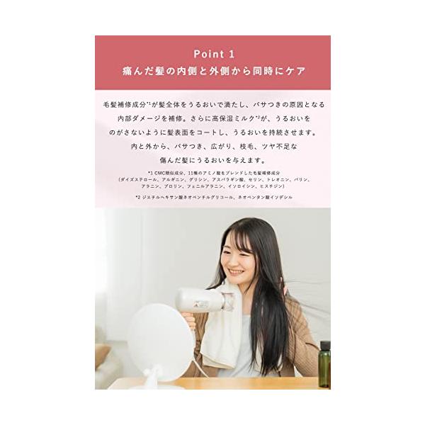 ・使用方法は簡単。適量を手にとって、タオルドライ後の髪(または乾いた髪)に、毛先を中心になじませます。 ドライヤーの熱を味方に、擬似キューティクルを作り、サラサラつるんの指通りを実現します。さらに高保水ミルクが、うるおいを逃がさないように髪表面をコート。内外からのしっかりケアで、うるおい健康美髪をずっとキープします。