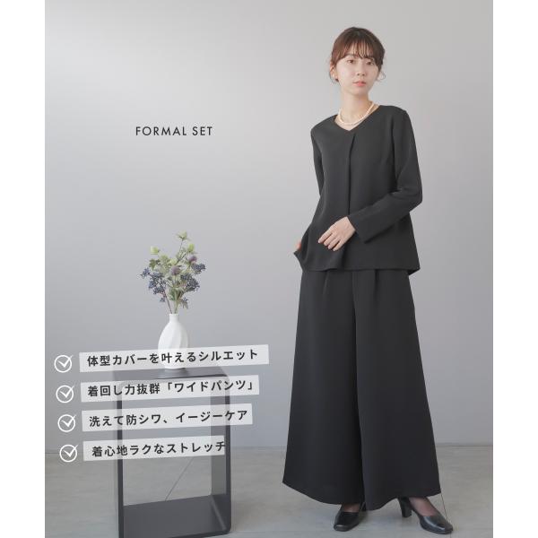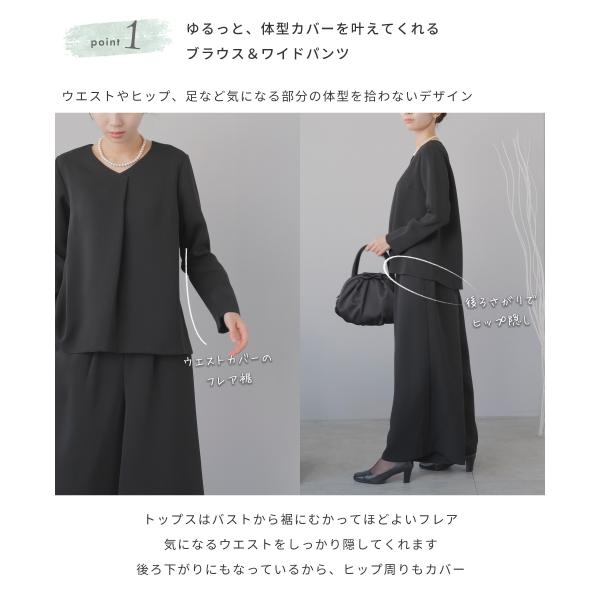 礼服 レディース パンツスーツ 喪服 ロング ワイドパンツ ブラックフォーマル 洗える ウォッシャブル ストレッチ ブラウス 2点セット 葬儀 20代 30代 40代