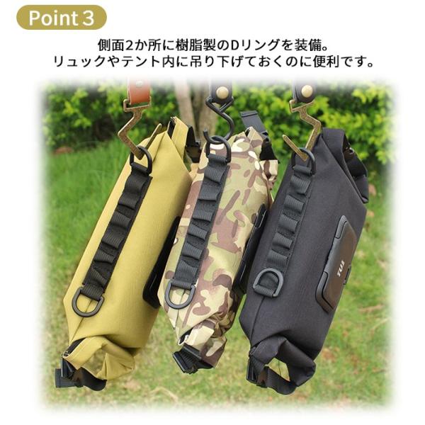 引っ掛けられるベルトやフックを多数搭載。