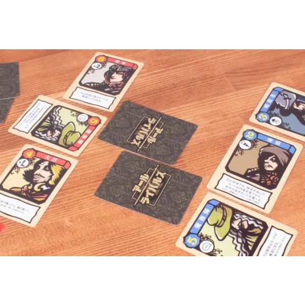 『アールライバルズ』は、0〜7の強さを持つ人物カードを手札に、お互いに1枚ずつ出しては、その強さや固有の能力で勝負する対決をくり返し、先に4勝を目指す、2人用カードゲームです。