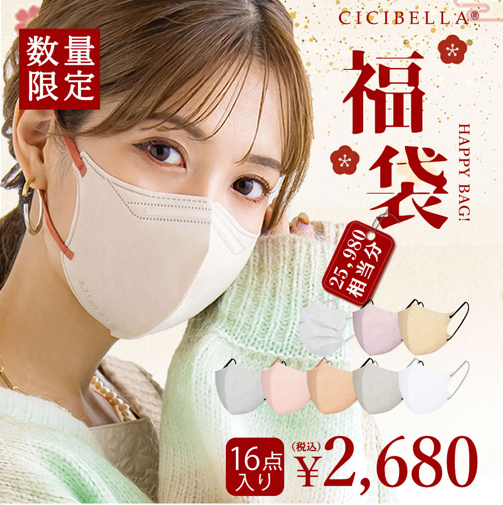 新春マスク福袋 数量限定 マスク 不織布マスク 立体マスク 3Dマスク 立体バイカラーマスク 福袋16袋セット 高評価 血色 人気アイテム入り CICIBELLA 大人気