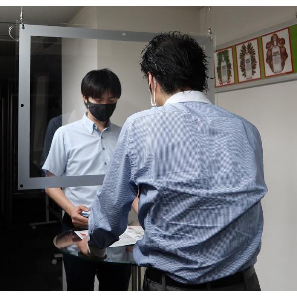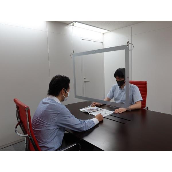 飛沫 受付 パーテーション 板 プレート コロナウイルス 飛沫感染防止対策用アクリルパーテーション 吊下げタイプです。 パーティションパネルの4辺はシルバー(裏はブラック)の枠が付いており、人目に付き誤って衝突するのを防ぎます。厚さ2mm、1.6kg軽い素材のため、お手持ちのロープや紐、テグス、ワイヤー等を四隅の穴に結んで簡単に設置でき、かつアクリル素材の適度な重量により、塩ビやペット素材と比べ、窓からの風、空調等による板面の揺れが起きにくい構造となっております。