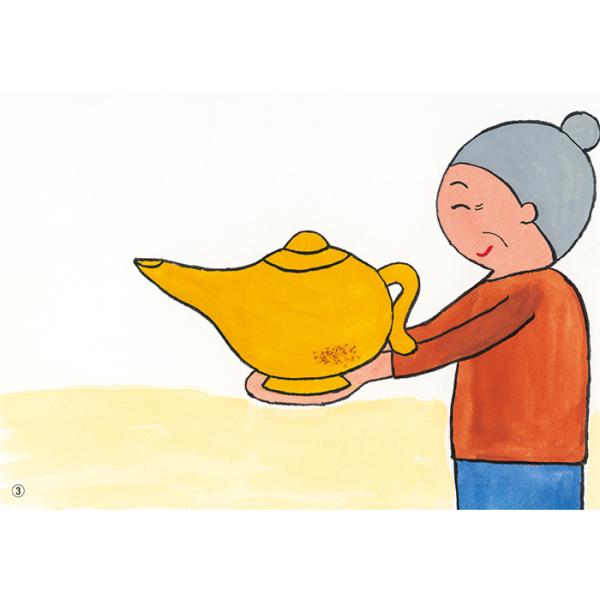 おじいさんに先立たれたおばあさん、片づけをしていたら魔法のランプを見つけます。ランプの精は三つの望みを叶えてくれるそう。一つ二つ三つ…、さあ、おばあさんのときめく第三の人生が始まります。