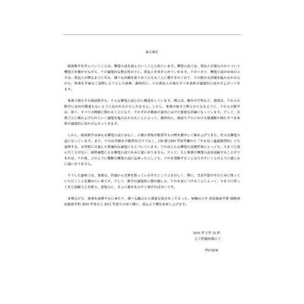 2018年3月に発刊された本書につきまして、読者の方々から大変にご好評を頂き、この度、改訂版を発売することになりました。本書は、大学で経済学を学んでいく上で必要になる、数学の素養を身につけることを目的にしています。大学で経済学を学んでいくためには、高校数学について十分に理解している必要がありますが、本書は、中学数学の知識だけでも、大学の経済学を十分に理解できるようにするため、初歩的な内容から詳しい説明をしています。また、その網羅している内容については幅広く、大学院で研究していく上で必要になってくる数学についても説明しています。そうした意味では、本書は、文系学部の数学を苦手とする学生に手に取って頂きたい本になっています。