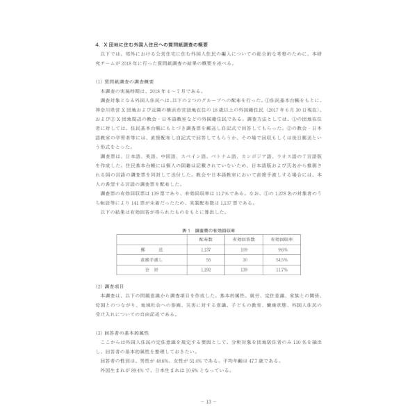 本書の対象地域である神奈川県X団地は県内最大の公営住宅もあることから、1980年代からとくにインドシナ難民受け入れを契機として、中国残留孤児の帰国者、南米日系人などの多くの外国籍住民が集住している。オールドカマーの在日コリアンの受入れから始まった「多文化共生」の文脈と比較して、本対象地域では1980年代から始まる中国帰国者やインドシナ難民の受け入れなど、行政や学校による「多文化共生」政策や取り組みの影響が大きい地域といえる。そこで、本書では地域社会で外国人住民をどのように受け入れるのかを考察し、それを可能にする諸条件を導き出すことを目的としている。
