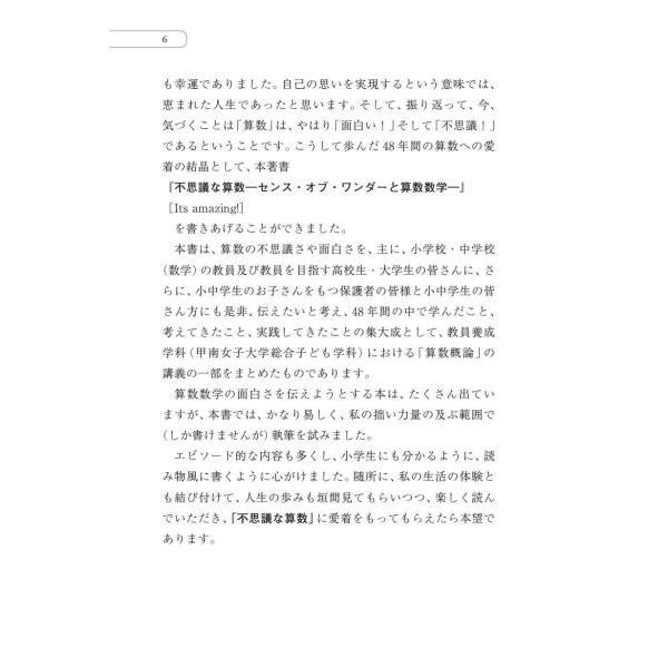 本書は、算数の不思議さや面白さを、主に、小学校・中学校(数学)の教員及び教員を目指す皆さんに、さらに、小中学生のお子さんをもつ保護者の皆様と小中学生の皆さん方にも是非、伝えたいと考え、筆者が48年間の教員経験の中で学んだこと、考えてきたこと、実践してきたことの集大成として、教員養成学科における「算数概論」の講義の一部をまとめたものであります。