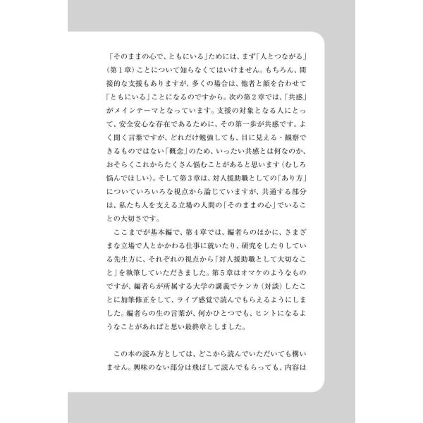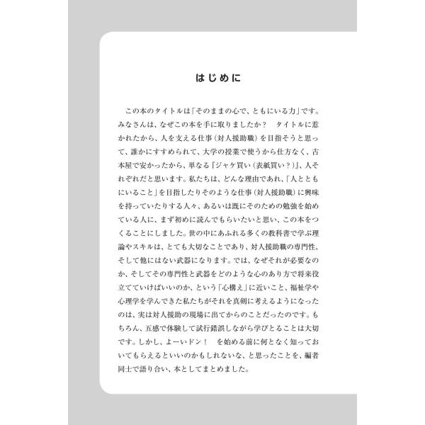 本書は対人援助職を志す人を対象に、対人援助の理念を具体的な体験を省察しながら噛み砕き、読者が「対人援助職のあり方、態度はこういうものなんだ」とわかることを目指しました。