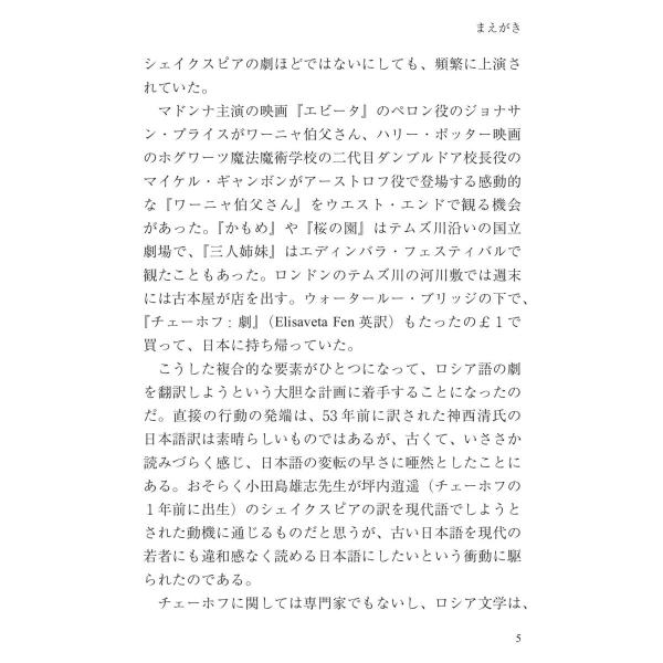 ロシアの劇作家アントン・チェーホフの四大劇の中から、第一弾として『かもめ』と『ワーニャ伯父さん』を取り上げ、読みやすい現代語に邦訳した意欲的な作品。あとがきと解説では、西洋における演劇の歴史に触れながら、初演当時の作家の評判やそれぞれの劇に対する観客の評価、チェーホフの生涯についても知ることができる。