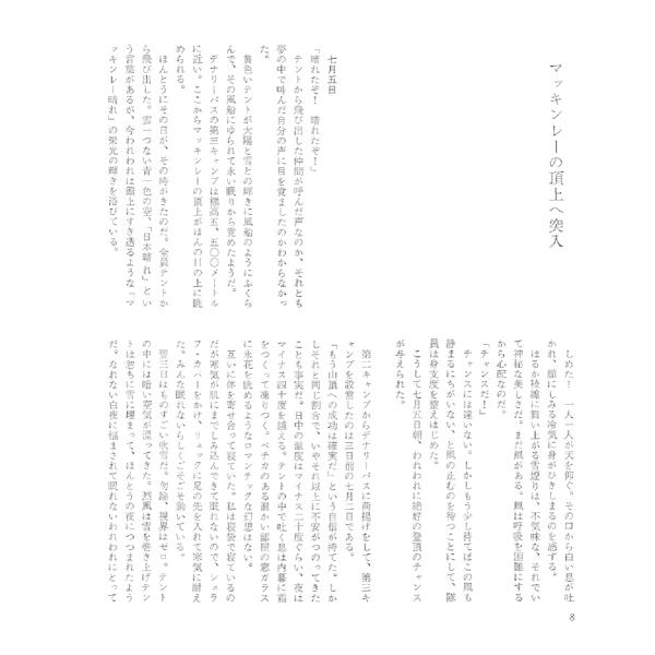 約一カ月半に及んだ登山と山頂からの滑降、下山に至るまで、日記形式で詳細に書かれた文章(マッキンレー・スキー登山日記)と、各ページに添えられたたくさんの写真が登山とスキーの様子を鮮明に描いています。
