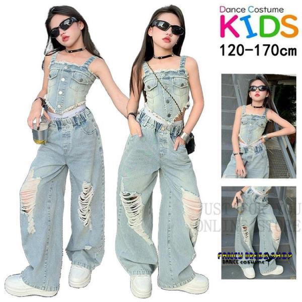 ブルー デニムスーツ ダメージパンツ キャミソール へそ出し キッズ ダンス衣装 セットアップ 女の子 ダンスウェア ステージ衣装 ヒップホップ 子供服 チアガー