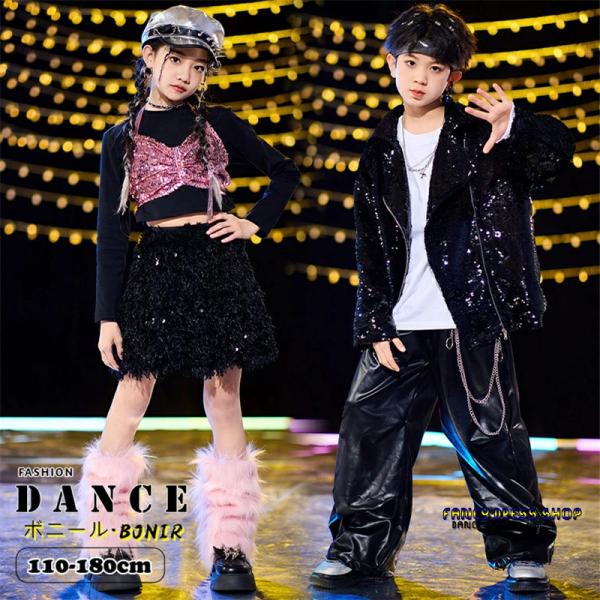 キッズ ダンス衣装 ヒップホップ 黒 スパンコール ジャケット 男の子 黒レザーパンツ 女の子 ジャズ ダンス スカート ピンク レッグウォーマー 韓国 K-POP かっ