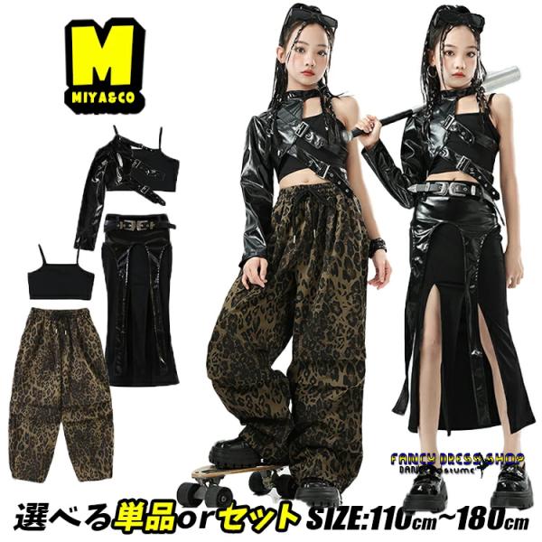 黒 袖 タンクトップ へそ出し 豹柄 カーゴパンツ 迷彩 黒 タイトスカート 革 キッズダンス衣装セットアップ ダンスウェア チアガール ガーリー ステージ衣装 カ