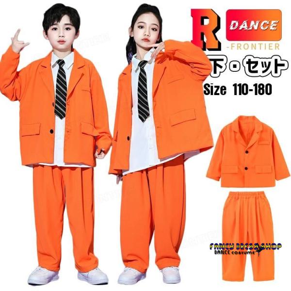オレンジ ダンススーツ キッズ ダンス衣装 セットアップ ジャケット ロングパンツ かっこいい ゆったり ダンス衣装 キッズ 韓国 k-pop 男の子 女の子 ヒップホッ