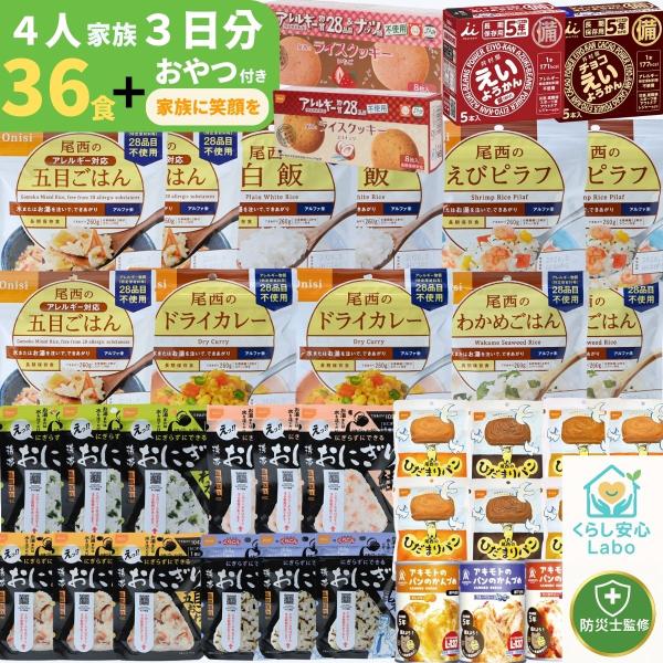 【防災士×管理栄養士監修】非常食セット 4人用 3日分 計36食+おやつ付き 尾西食品 アルファ米 携帯おにぎり パン 災害用 長期保存 備蓄食料