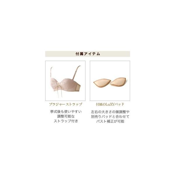 ショーツはバック中央にギャザーを寄せヒップ丸みを潰さず、ブラジャーは付属のストラップ付きで、ブライダル後も長くお召し頂けます。