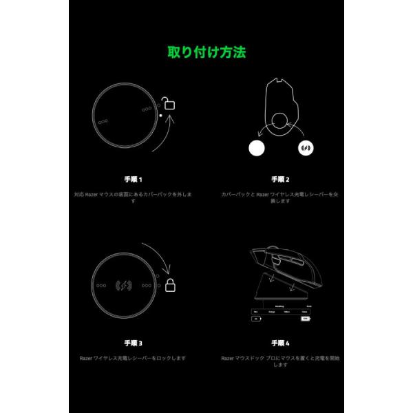 【マグネット式ワイヤレス充電】 充電がかつてないほど直感的で簡単になりました。Razer対応マウスにワイヤレス充電レシーバーを取り付けて、ドックに置くだけで簡単に充電が開始されます。マグネット式により充電中は外れることなく安定して充電できます。