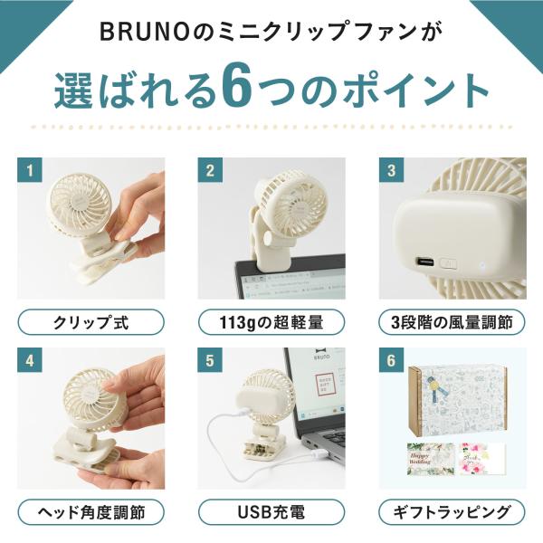 公式 BRUNO ミニクリップファン ブルーノ BDE066 超軽量 小型 クリップ付き USB 充電式 風力3段階 ヘッド向き調節可能 卓上ファン 扇風機