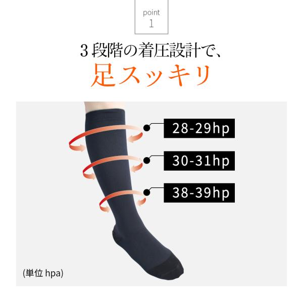 ※締めつけ(単位 hpa):履き口28-29、ふくらはぎ30-31、足首38-39