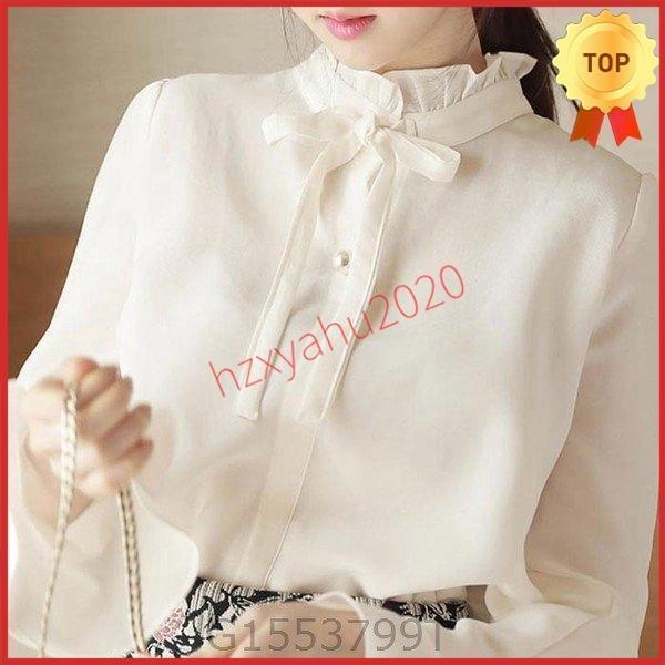 リボンブラウスレディース襟フリル長袖おしゃれ白ピンク可愛いかわいいリボンタイシャツ秋冬春立ち襟スタンドカラー春服演奏会フォーマル