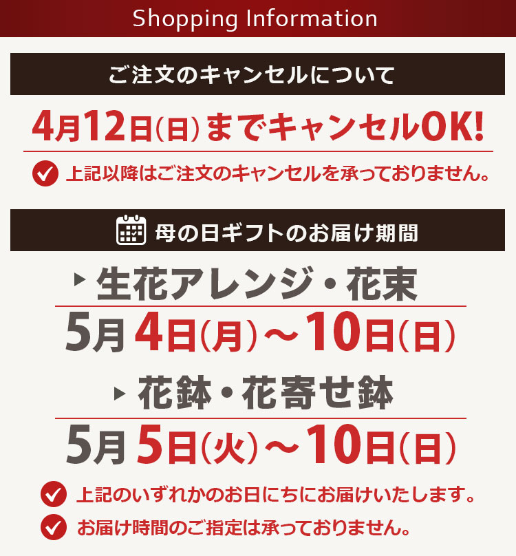 母の日特集商品は2026年5月4日(月)〜10日(日)のいずれかにお届けいたします。