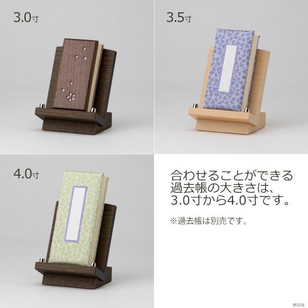過去帳を置いておく見台です。雰囲気も大きさもモダンミニ仏壇にぴったりです。過去帳は3.0寸から4.0寸をお勧めいたします。過去帳を開いたままにしておけるツメが付いています。芯材のMDFに、木目の入ったポリプロピレンシートを表面材として張り付けてあります。 側面の一部シート張りではなく、塗装の部分があります。