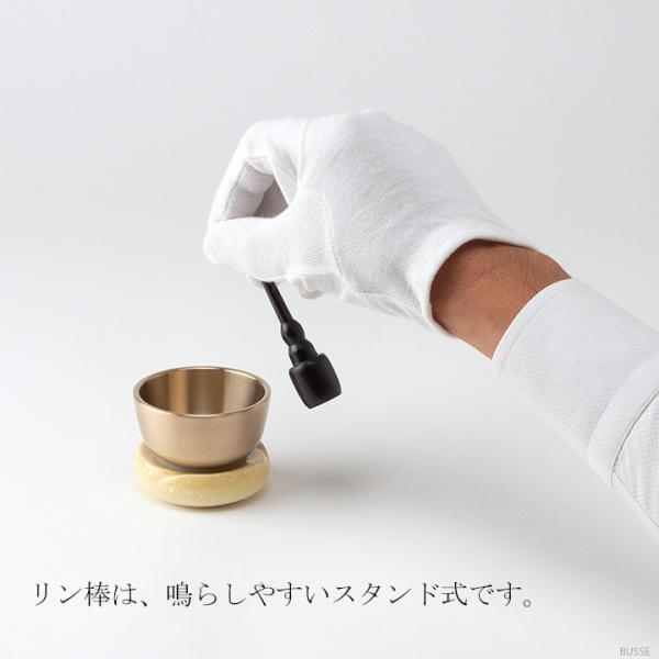 おリンを鳴らすための「リン棒」は、当店ではモダンなデザインのスタンド式のものをご用意いたしております。立てて置けるので、お仏壇の中で転がることはありません。また、スペースをとらず、小さいお仏壇でも置き場所に困ることはありません。