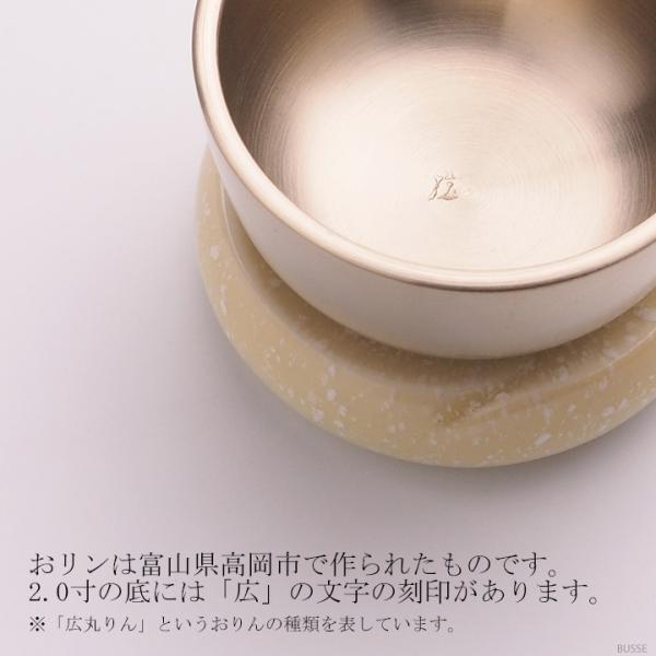 仏具セットと色・形をそろえて使っていただけるリン台とおリン、スタンドリン棒のセットです。おリンは富山県高岡市で作られたものです。高級品ではありませんが、国産品らしく、きちんと作られた、よく鳴るおリンです。おりんの大きさは、2.0寸(直径約6.0cm)のものと、2.3寸(直径約6.9cm)の2種類よりお選びいただけます。音色を比較すると、2.0寸の方がより高く軽やかな音、2.3寸の方がやや低く落ち着いた音です。