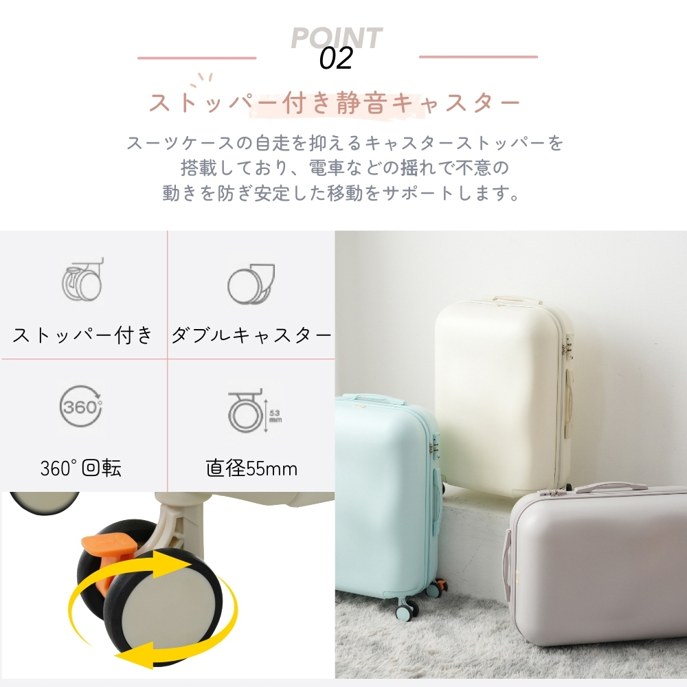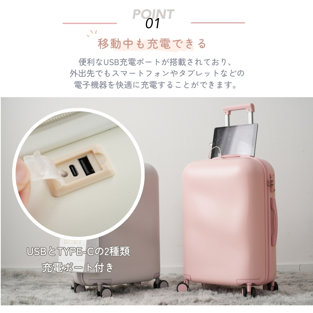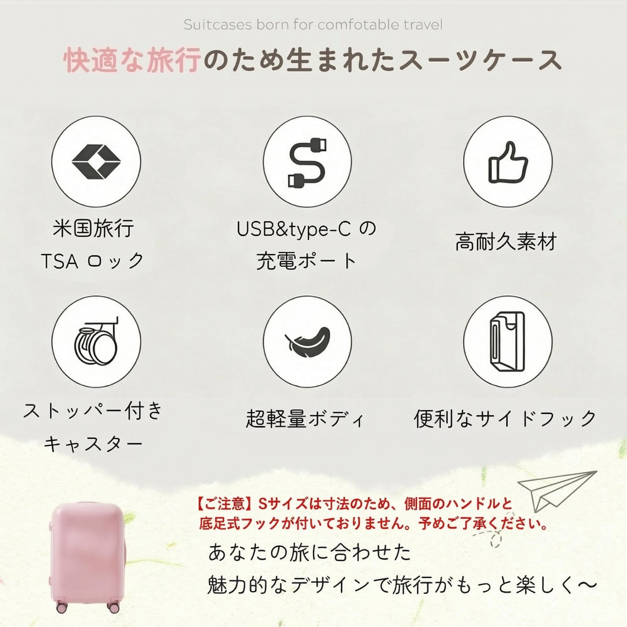 商品名:スーツケース Sサイズ Mサイズ Lサイズ 軽量 キャリーバッグ USBポート付き TSAロック ストッパー付き ダブルキャスター スムーズ 静音 静か 頑丈 海外 修学旅行 女性 新幹線 大容量 かわいい 旅行 国内 suitcase TANOBI ZBX07