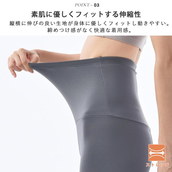 縦横に伸びの良い生地が素肌にぴたっとフィットし、締め付け感なく動きやすい。