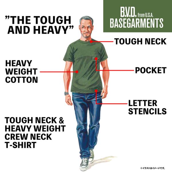 「タフネック&ヘビーウエイトT」の第一作を示す文字が二行でボディフロントの裾部へプリント。B.V.D.の歴史あるアメリカンホームウエアとしての「重み」を表現するため、米国国防省が定めた規格のミルスペックでよく見られるナンバリングもプリント。