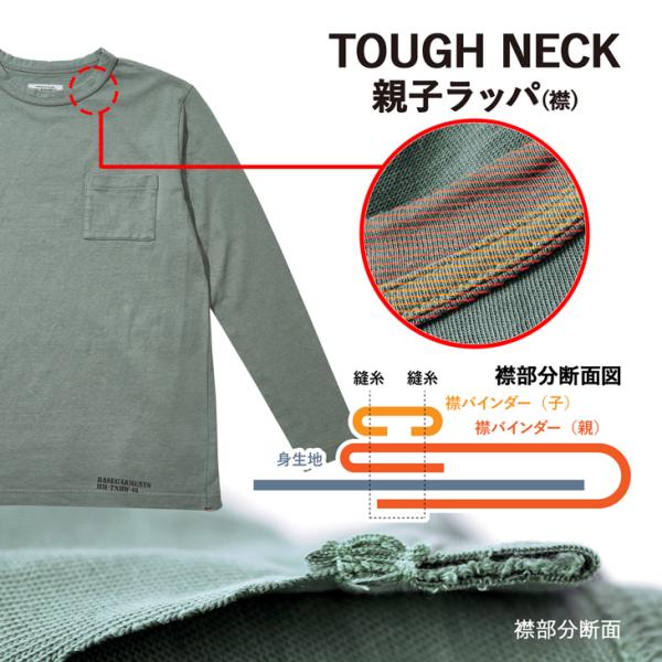 B.V.D.の代名詞でもあるタフネックのディテールに徹底的にこだわり、バインダー仕上げをさらに補強生地によって強化する「親子ラッパ」を使用。