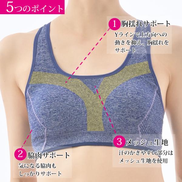 フロントはYラインの編み地でバストの上方向への揺れを防ぎ、バックは肩甲骨と背骨に沿ったラインで背筋をしゃきっとサポート。