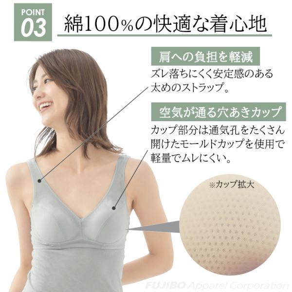 綿100%天然素材の肌にやさしい着心地で締め付け感がなく、着用時もストレスフリーに。