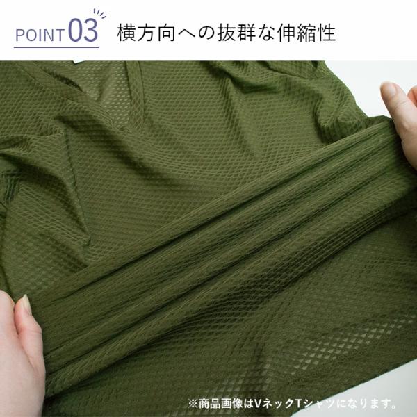 シャツの中にこもった汗をすばやく外に拡散させるよう促し、肌のサラサラ感を保ちます。