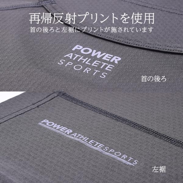 首の後ろと裾の左側に※再帰反射プリントを施しており、夜間や暗がりでも視認性を確保してくれます。