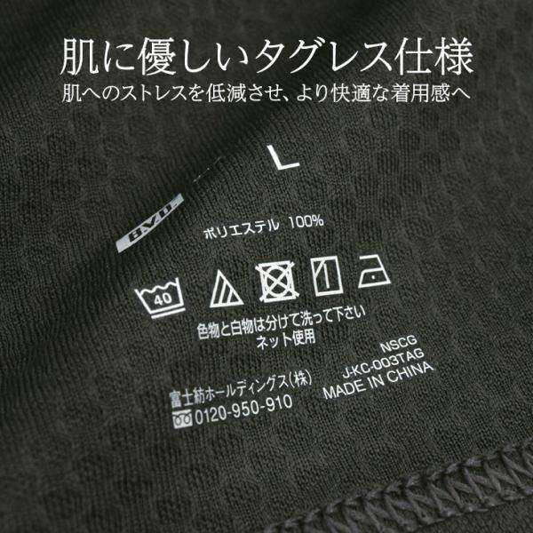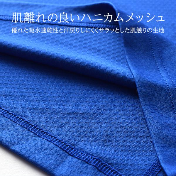 ハニカムメッシュ素材で通気性、吸水速乾性に優れており、汗をかいてもハニカム構造によって肌との接触面積が小さくなり、汗戻りしにくくベタつかずサラッとした着心地。