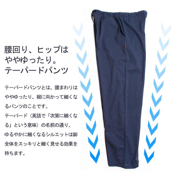 腰回り、ヒップはややゆったりめで、裾にかけて細くなるテーパードパンツ。