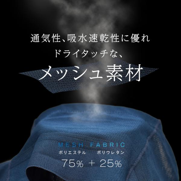 メッシュ素材は、肌と生地の接触面が少なく、涼しさを感じられ、網目状の隙間から空気を通して熱を逃がすので、ムレにくく通気性の良さを実感いただけます。