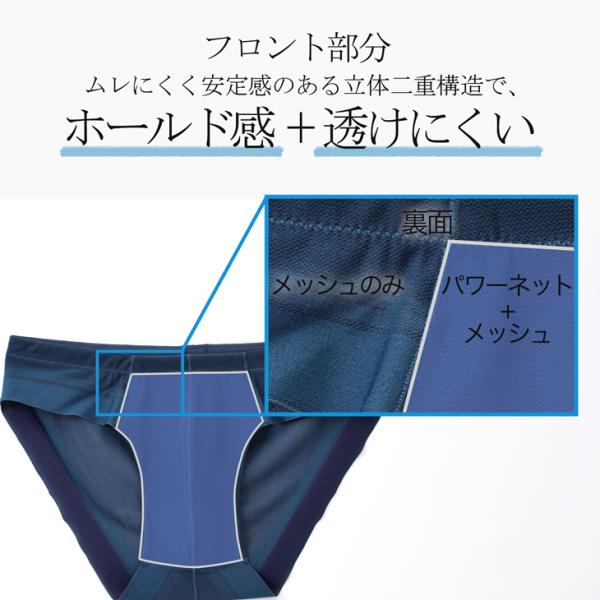 着用感が軽く涼しい吸水速乾メッシュをベースに、フロント部分の裏地にパワーネットを重ね、通気性を確保したまま安定感をアップ。