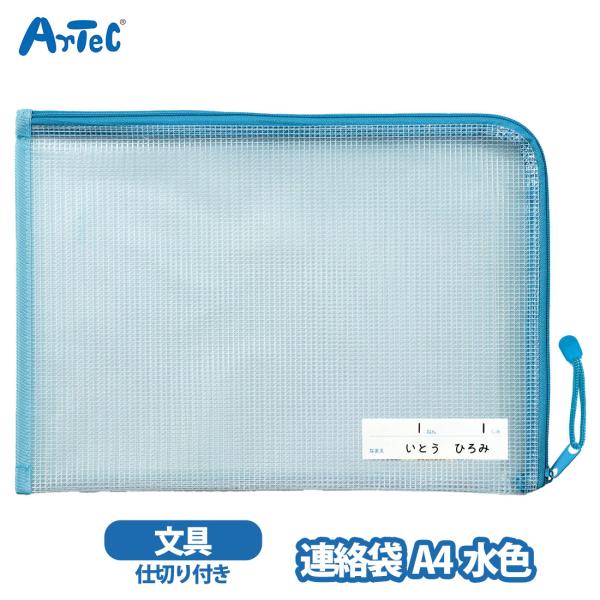 連絡袋 仕切り付 artec A4 水色 メッシュ素材 L字チャック 書類ケース 男の子 女の子 小学生