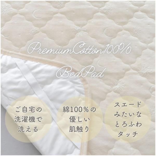 コットン100%でふっくら,優しい肌触り肌もココロもいたわる優しい敷パッド上質な綿100%のキルト地を使用しており,肌触りがなめらかで心地よい寝心地を実現太陽と月のかわいらしい柄は大人からお子様まで使いやすいデザイン通気性,保温性のバランスに優れ,一年を通してご使用いただけます秋冬の寝汗対策にも綿素材はマストシンプルでおしゃれなデザインは,北欧やモダンなインテリアにも馴染みます洗えば洗うほど,コットンの特性でしっとり肌に馴染みますサイズベビーキッズ 70 x 120cmシングル 100 x 200cmセミダブル 120 x 200cmダブル 140 x 200cmクイーン 160 x 200cm素材毛布部 綿100%基布部 ポリエステル100%