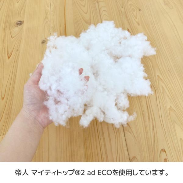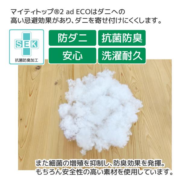 マイティトップ(R)2 ad ECOはダニを寄せ付けにくく、細菌の増殖を抑えて防臭効果を発揮。またポリエステルわた自体の特性としてわたぼこりも出にくいです。