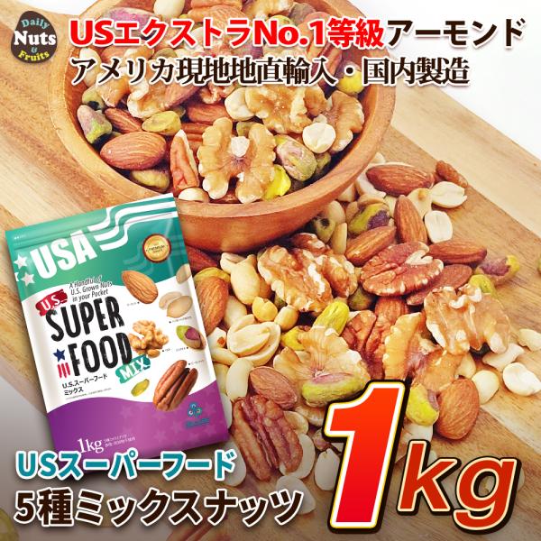 USスーパーフード5種ミックスナッツ 素焼き (アーモンド・くるみ・ピーナッツ・ピーカンナッツ・ピスタチオ) アメリカ直輸入 アルミチャック付き袋 無塩