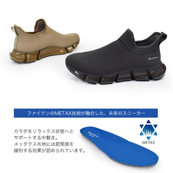 このスニーカーは、ファイテンのMETAX技術を搭載し、身体をリラックス状態へと導くことで、快適な歩行をサポートします。