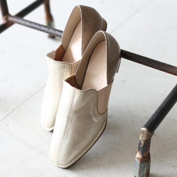 サイドがゴムで脱ぎ履きがしやすい、スクエアトゥスリッポンシューズ。